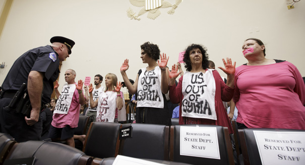 Protestors bring their anti-war message to the House Foreign Affairs Committee, on Capitol Hill in Washington, Wednesday, Sept. 4, 2013, before a hearing on President Barack Obama’s request for congressional authorization for military intervention in Syria, a response to last month’s alleged sarin gas attack in the Syrian civil war. (AP Photo/J. Scott Applewhite)