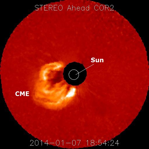 Coronal mass ejections are more likely to have a significant effect on our activities than flares because they carry more material into a larger volume of interplanetary space, increasing the likelihood that they will interact with the Earth. While a flare alone produces high-energy particles near the Sun, some of which escape into interplanetary space, a CME drives a shock wave which can continuously produce energetic particles as it propagates through interplanetary space. When a CME reaches the Earth, its impact disturbs the Earth’s magnetosphere, setting off a geomagnetic storm. A CME typically takes 3 to 5 days to reach the Earth after it leaves the Sun. Observing the ejection of CMEs from the Sun provides an early warning of geomagnetic storms. Only recently, with SOHO, has it been possible to continuously observe the emission of CMEs from the Sun and determine if they are aimed at the Earth.