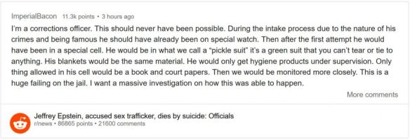 The 66-year-old Epstein was was previously placed on suicide watch after he was found “nearly unconscious” inside his cell with ‘marks on his neck,’ according to a Post report from late July. Investigators questioned former Orange County police officer Nicholas Tartaglione, suspected of killing four men in a cocaine distribution conspiracy, in connection with the incident. The former cop claimed to have not seen anything nor touched Epstein.
