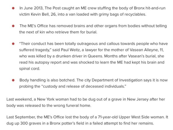 Check out the following from a 2014 New York Post article, Lost Bodies, Wasted Money: Inside NYC’s Medical Examiner’s Office