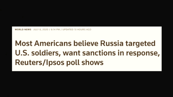 “A majority of Americans believe that Russia paid the Taliban to kill U.S. soldiers in Afghanistan last year amid negotiations to end the war, and more than half want to respond with new economic sanctions against Moscow, according to a Reuters/Ipsos poll released on Wednesday,” Reuters reports.