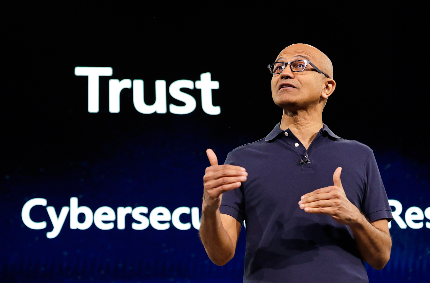 FILE – In this May 6, 2019, file photo Microsoft CEO Satya Nadella delivers the keynote address at Build, the company’s annual conference for software developers in Seattle. Microsoft says it has detected more than 740 infiltration attempts by nation-state actors in the past year targeting U.S.-based political parties, campaigns and other democracy-focused organizations including think tanks and other non-profits. (AP Photo/Elaine Thompson, File)