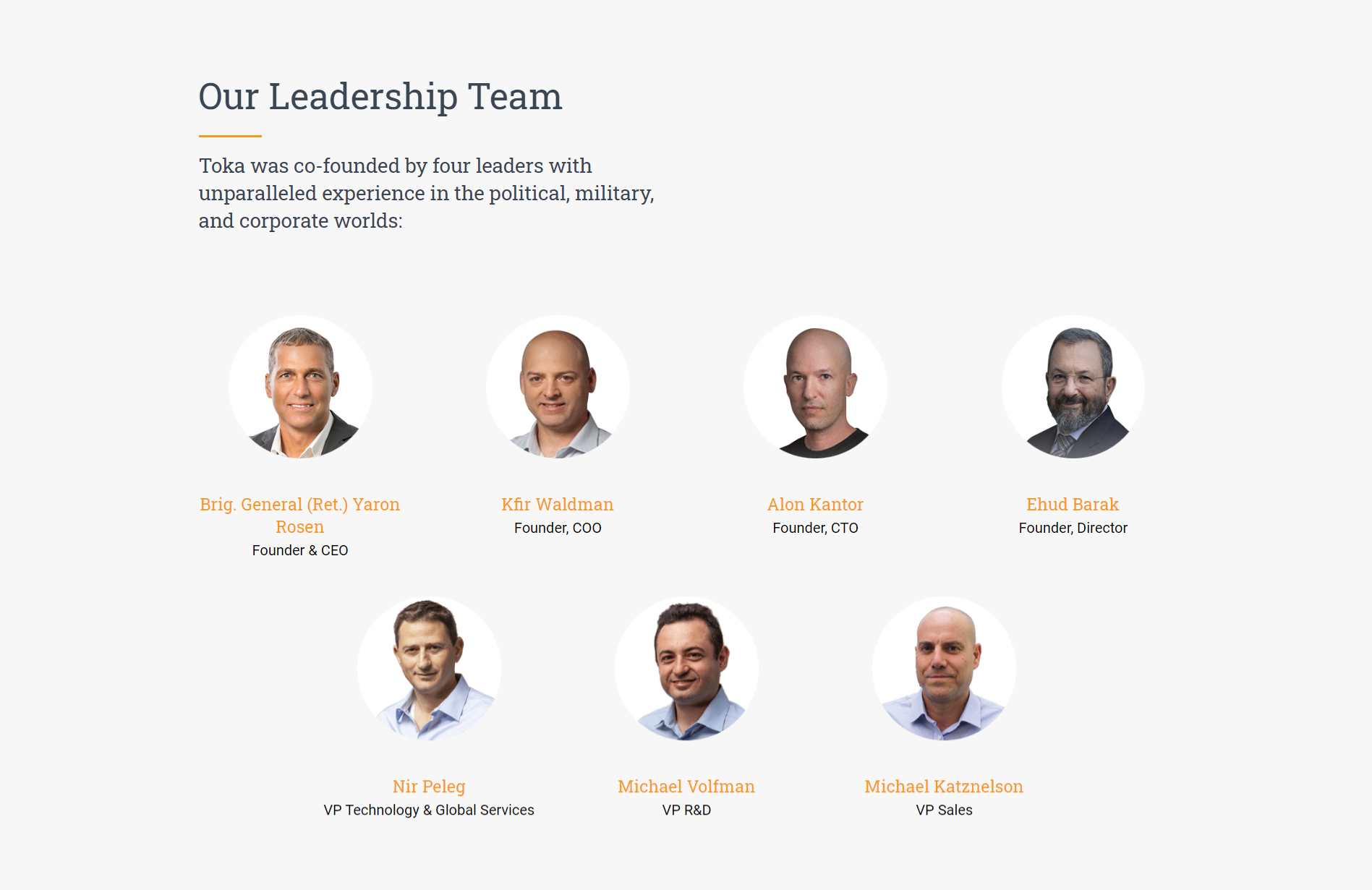 In addition to Barak, Toka was co-founded by retired Brigadier General Yaron Rosen, former Chief of the IDF’s cyber staff, where he was “the lead architect of all [IDF] cyber activities” including those executed by Israeli military intelligence Unit 8200. Rosen, who now serves as Toka’s CEO, has stated that Toka’s technology will only be sold to countries allied with the U.S. and Israel, telling Forbes that “Russia, China and ‘other enemy countries’ would never be customers.”