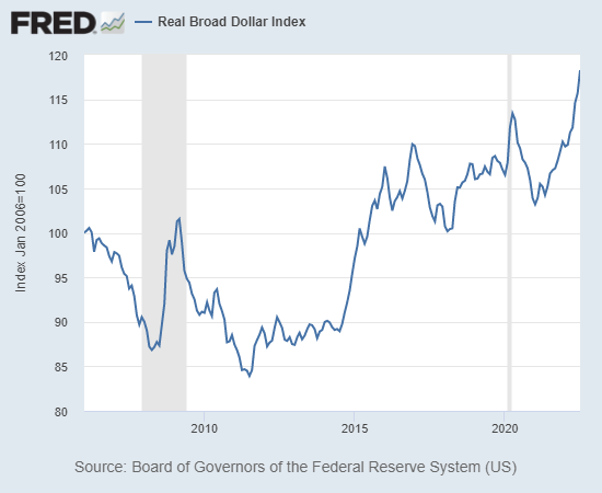2. The strength of the U.S. dollar is exporting inflation, to the benefit of the domestic economy. After offshoring critical supply chains–a disaster that will take years to reverse–now the U.S. is offshoring inflation and the resulting demand destruction.