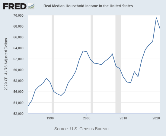 There is much more to say but glance at these two charts: real (i.e. adjusted for official inflation) median household income and real Broad U.S. Dollar Index.