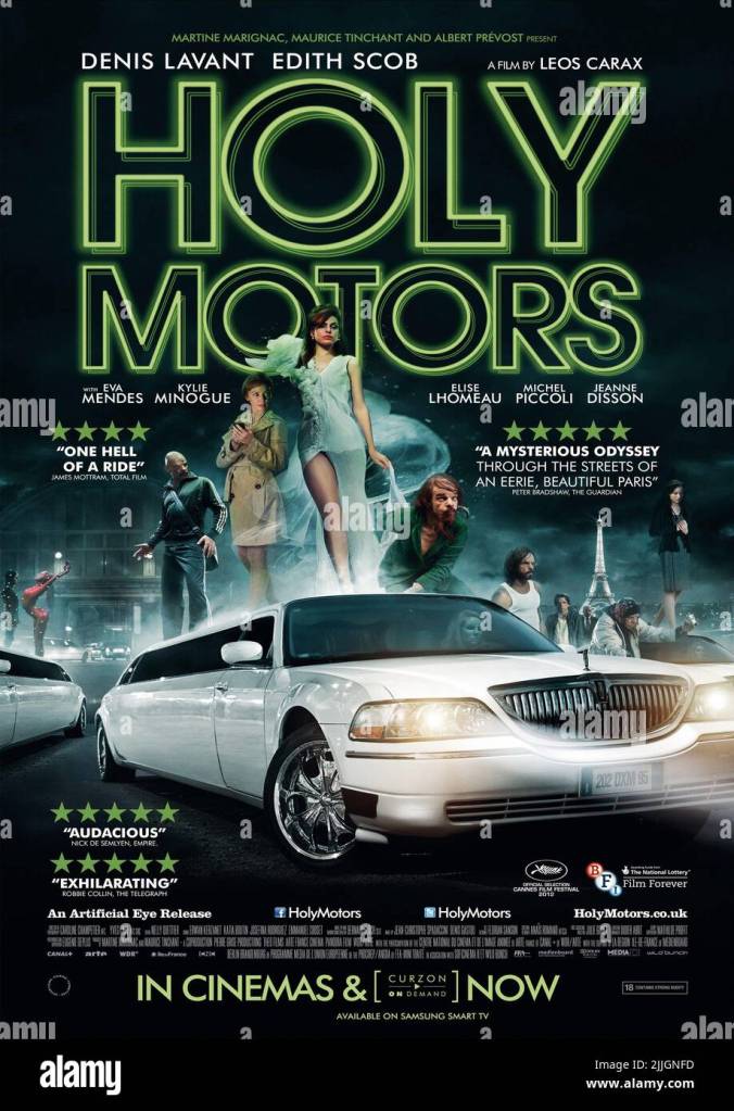 Here is M. Oscar transforming a fashion model (Eva Mendes) into a Muslim woman concealed within her costume. And that’s not all that happens to her, although she adheres to the model’s code and never betrays emotions or opinions. Her job is to embody a beautiful object for the purposes of others. Their travels through the city lead to the roof of the Samaritaine department store, producing stunning vistas of Paris.Celine (Edith Scob), his reserved chauffeur, seems long accustomed to her role. Once she expresses concern that M. Oscar hasn’t eaten all day. Their day began at dawn and lasts far into the night, one “appointment” after another.This has been a year of leading roles for limousines. M. Oscar’s car upstages the limousine in David Cronenberg’s “Cosmopolis,” and the journeys of both cars seem to be odysseys through their cities, for purposes not very clear to the audience. “Holy Motors” is the more entertaining and funny of the two, although some parts are not funny at all, and many laughs are of disbelief or incredulity. Both end with their limousines going home for the night, answering a question asked in “Cosmopolis,” although when the limo in “Holy Motors” gets home, its day is far from over.Here is a film that is exasperating, frustrating, anarchic and in a constant state of renewal. It’s not tame. Some audience members are going to grow very restless. My notion is, few will be bored.