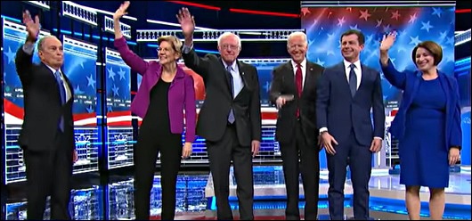 Democratic Debate February 19, 2020 (Left to Right: Michael Bloomberg, Senator Elizabeth Warren, Senator Bernie Sanders, former Vice President Joe Biden, Pete Buttigieg, Senator Amy Klobuchar.)