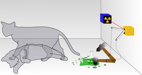 Wikipedia: “In Schrödinger’s original formulation, a cat, a flask of poison, and a radioactive source are placed in a sealed box. If an internal monitor (e.g. a Geiger counter) detects radioactivity (i.e. a single atom decaying), the flask is shattered, releasing the poison, which kills the cat. The Copenhagen interpretation implies that, after a while, the cat is simultaneously alive and dead. Yet, when one looks in the box, one sees the cat either alive or dead, not both alive and dead. This poses the question of when exactly quantum superposition ends and reality resolves into one possibility or the other.”
