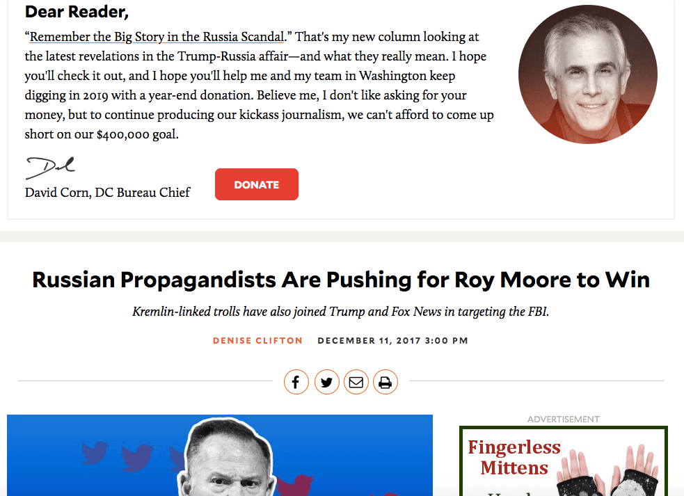 BuzzFeed, of course, is the sensationalist outlet that irresponsibly published the Steele dossier in full, even though the accusations – not just about Donald Trump but also many other individuals – weren’t verified. Then on Nov. 14, BuzzFeed reporter Jason Leopold wrote one of the most ludicrous of a long line of fantastic Russia-gate stories, reporting that the Russian foreign ministry had sent money to Russian consulates in the U.S. “to finance the election campaign of 2016.” The scoop generated some screaming headlines before it became clear that the money was to pay for Russian citizens in the U.S. to vote in the 2016 Duma election.