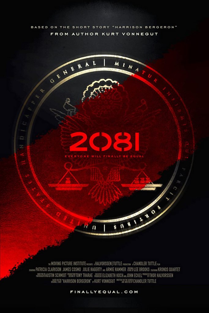 2081 is a 2009 science fiction featurette which premiered at the Seattle International Film Festival on May 29, 2009. It is directed and written by Chandler Tuttle, based on the 1961 short story “Harrison Bergeron” by author Kurt Vonnegut. The cast is led by James Cosmo, Julie Hagerty, Patricia Clarkson, and Armie Hammer. The story paints a picture through the use of hyperbole of a future in which a powerful, dictatorial government goes to extreme measures to ensure that absolute equality exists between all individuals.