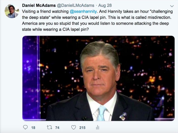 McAdams, who spent much of his time on Twitter calling out the war machine supported by both parties, was recently permanently banned from the platform for so-called “hateful conduct.” His crime? Challenging Fox News anchor Sean Hannity over his hour-long segment claiming to be against the “deep state,” while simultaneously wearing a CIA lapel pin. In the exchange, McAdams called Hannity “retarded,” claiming he was becoming stupider every time he watched him.