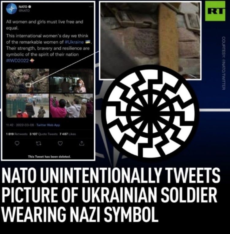 Then there is the strange case of NATO tweeting in celebration of international women’s day, this past March 8, a picture of a female Ukrainian soldier wearing the Black Sun symbol which is tied to Nazi occultism, and Satanism. NATO wrote in their post “All women and girls must live free and equal,” sending a very mixed message. NATO also ended up taking down their picture of the Black Sun symbol.