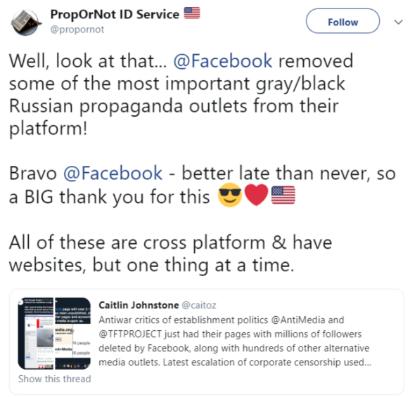 With the latest Facebook and Twitter purges, ordinary citizens like Shilling are being targeted in the open, and without apology. The mass deletions of alternative media accounts illustrate how national security hardliners from the German Marshall Fund and Atlantic Council (and whoever was behind PropOrNot) have instrumentalized the manufactured panic around Russian interference to generate public support for a wider campaign of media censorship.