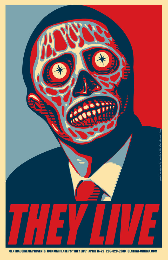 They Live is a cult classic sci-fi/action buddy film based on the short story Eight O’Clock in the Morning by Ray Faraday Nelson (who happened to be one of Philip K. Dick’s closest friends). Roddy Piper plays Nada, a drifter searching for work during a recession who accidentally stumbles across an alien plot to take over the world by programming the masses to obey and consume using subliminal messages. Widely considered one of director John Carpenter’s best and smartest films, it was also part of a late 80s sub-genre of films containing as a subtext sharp critiques of U.S. government policies and the Reagan administration in particular. Other films include Wes Craven’s “The People Under the Stairs”, Paul Verhoeven’s “Robocop” and Dan O’Bannon’s “Return of the Living Dead”.